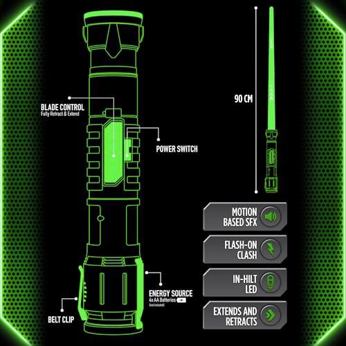 Power Saber is the world’s first fully auto extending & retracting saber. With motion based SFX, flash on clash & in an in-hilt LED, this saber delivers the most realistic experience. Extend the saber to 35’’/90cm and get ready for battle! After battle, the Power Saber can be displayed on the included stand or carried around with the belt clip. This saber is suitable for kids ages 6 and up and recommended for any fan. Available in red & green, choose your side! Requires 4 x AA batteries (not included). Winner of the 2024 Toy & Game International Excellence (TAGiE) Award for Toy Innovator of the Year.